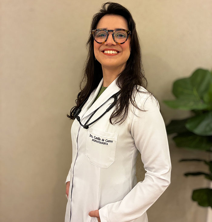 A Dra. Camilla de Castro (CRM 52-100671-1) é médica especialista em Reumatologia formada pelo Hospital Universitário Pedro Ernesto, instituição pertencente à UERJ. Realiza atendimento em Ipanema, no coração da Zona Sul do Rio de Janeiro. Com foco em atendimento integral, diagnóstico preciso e tratamento humanizado, dedica-se a cuidar de pacientes com dores articulares, doenças autoimunes e condições inflamatórias que afetam a qualidade de vida.